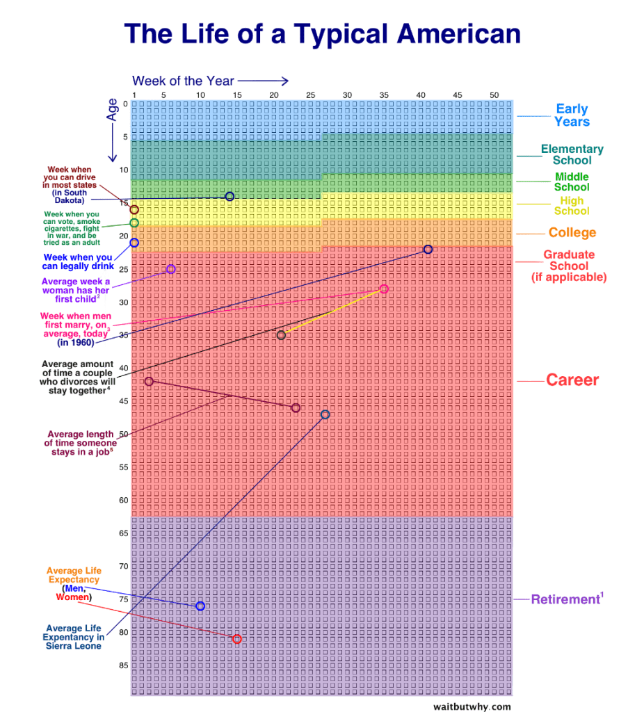 When I read today’s prompt I thought of Wait But Why, the cool blog by Tim Urban where he draws stick figures and talks about random things. One post that I loved was Your Life in Weeks.